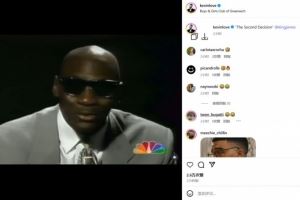 詹姆斯的好基友凯文-乐福更新IG晒出乔丹的演讲视频,并打趣詹姆斯:“决定二”。